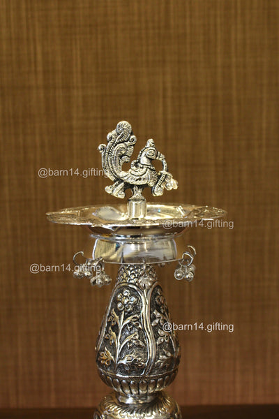 Our exquisite Peacock Diya Stand is a captivating fusion of elegance and craftsmanship that will illuminate your space with grace and charm. Inspired by the majestic peacock, this diya stand is a stunning centerpiece that combines traditional artistry with the timeless allure of silver plating. Its versatile design allows it to be displayed as a stunning centerpiece for festivals, ceremonies, or special occasions, infusing your space with the enchanting beauty of Indian traditions.