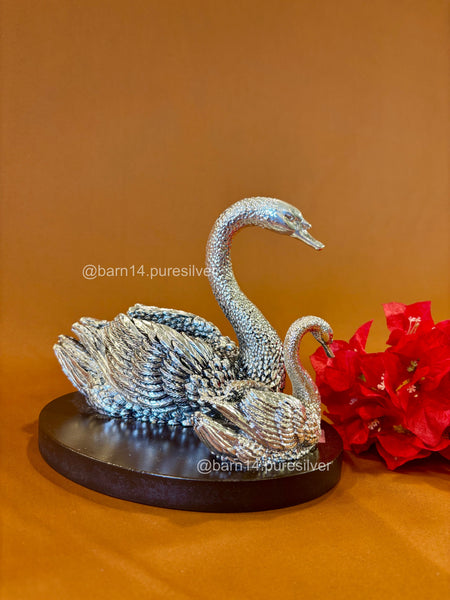 Celebrate love, unity, and elegance with this beautifully crafted Pure Silver Mother & Baby Swan on a wooden base. Nestled in a premium box, it is not just a decorative piece but a timeless treasure, perfect for gifting on weddings, anniversaries, housewarmings, or as a cherished addition to your own collection. The shimmering silver finish, combined with fine detailing, ensures it stands out as a symbol of refined taste and thoughtful craftsmanship.