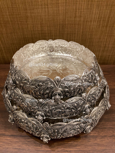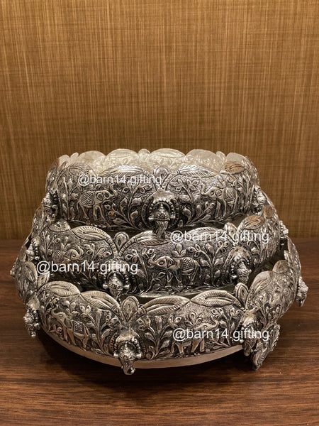 A statement piece of art and tradition, the Vanraj Urli features exquisite carvings of elephants and floral motifs — symbols of strength, prosperity, and grace. Perfect for filling with water, petals, or floating diyas, it enhances any festive or everyday décor with regal charm. An elegant choice for weddings, housewarmings, or luxury gifting.