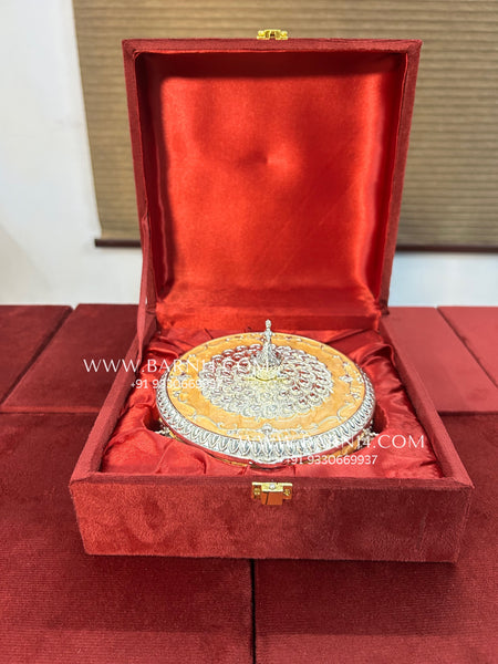 Featuring intricate silver-toned peacock designs with a peacock on top, this enamel dry fruit box is a true work of art. Available in a range of beautiful colors, it effortlessly adds a touch of sophistication to any setting. Perfect for gifting on weddings, anniversaries, or festivals, this box combines practicality with elegance, making it a charming and memorable present.