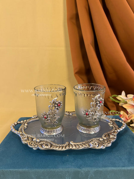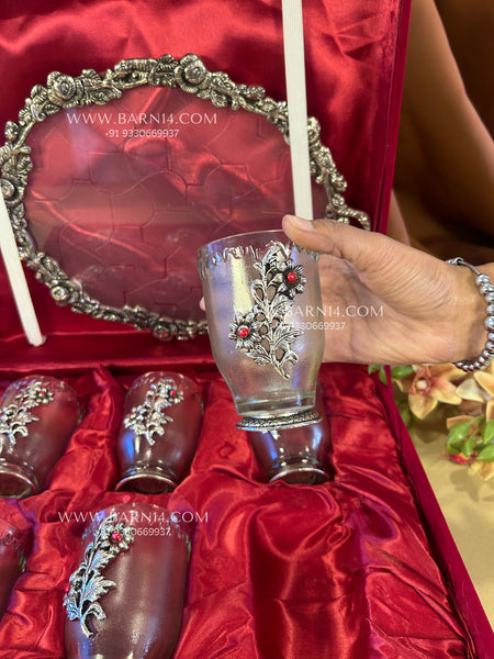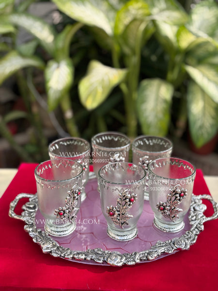 Mehmaan Nawazi Set is a beautifully crafted German silver tray paired with delicately designed glassware, made to serve your guests with grace. The embossed floral detailing adds a subtle festive charm, while the sturdy tray ensures ease of serving. Perfect for hosting at home, festive gatherings, or thoughtful gifting, this set brings together tradition, elegance, and everyday usability. A timeless addition to any table where hospitality matters.