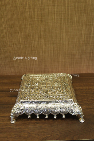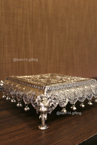 Bring home the charm of tradition with this beautifully crafted German Silver Ghungroo Chowki. Designed with intricate detailing and adorned with delicate ghungroo bells, this chowki is perfect for placing idols, diyas, or puja thalis. The silver finish adds a royal touch, making it ideal for puja rituals, festivals, weddings and gifting.
