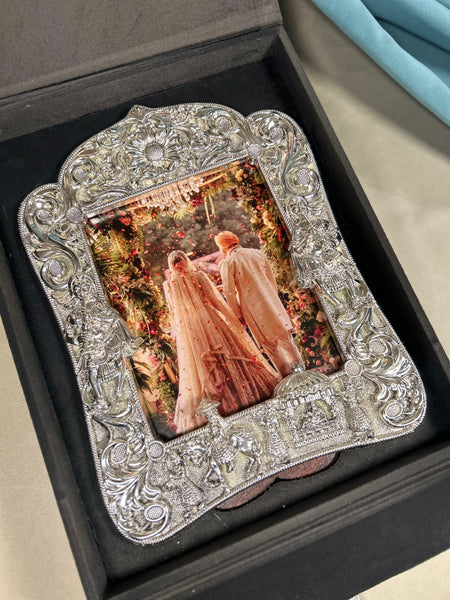 Capture the most special moment of a lifetime with our Pure Silver Shubh Vivaah Photo Frame, crafted in 999 pure silver. Designed to hold wedding memories beautifully, this frame symbolizes shubh vivaah, blessings, and togetherness—making it a perfect gift for newlyweds.