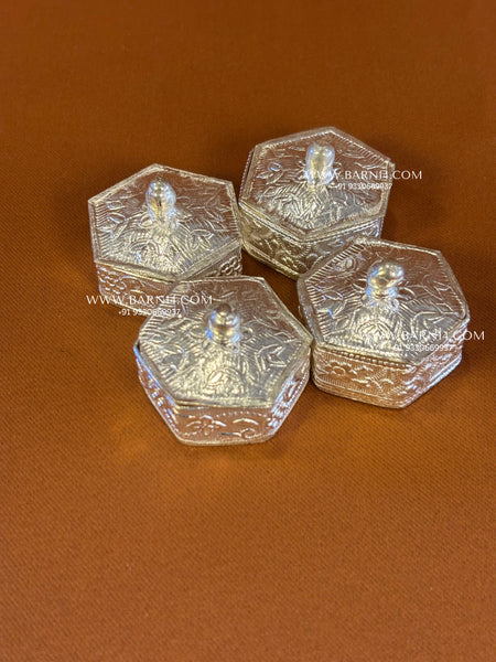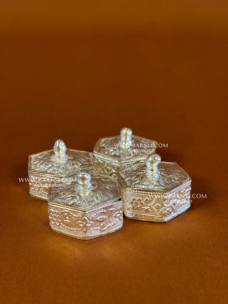 Celebrate heritage with our beautifully crafted Hexagon Knob Dabbi, a charming fusion of functionality and festive flair. Traditionally used to present coins or small gifts during special occasions, this dabbi is an elegant symbol of prosperity and good wishes. Made from high-quality metal with a silver or gold finish, it features a compact, multi-layered design that makes it both practical and visually appealing.
