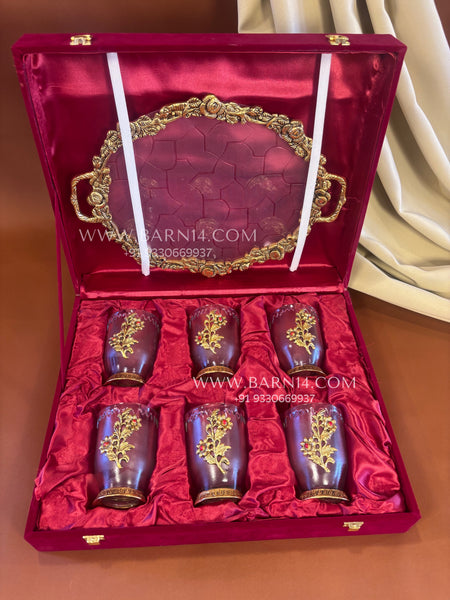 Mehmaan Nawazi Set is a beautifully crafted German silver tray paired with delicately designed glassware, made to serve your guests with grace. The embossed floral detailing adds a subtle festive charm, while the sturdy tray ensures ease of serving. Perfect for hosting at home, festive gatherings, or thoughtful gifting, this set brings together tradition, elegance, and everyday usability. A timeless addition to any table where hospitality matters.